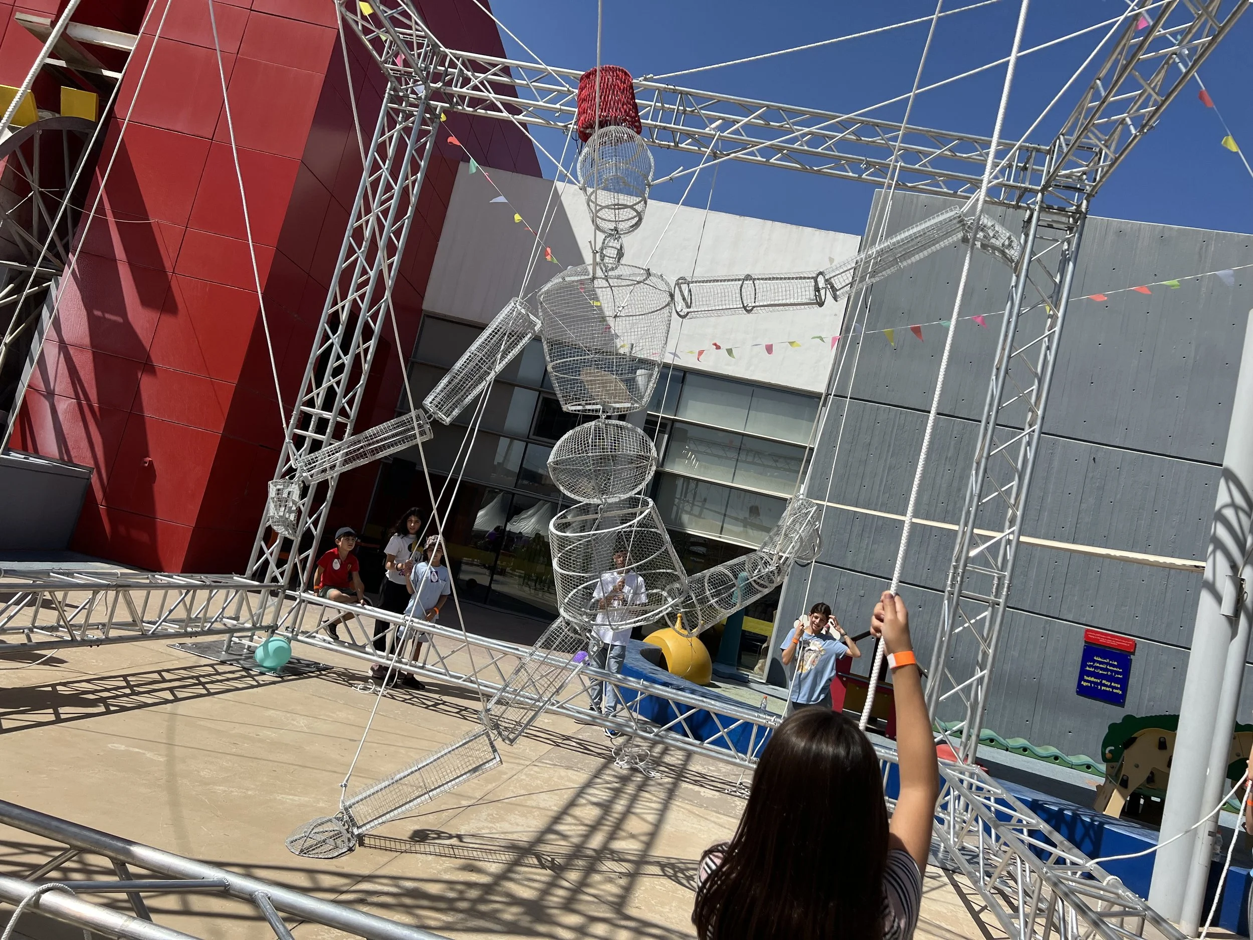 In Alwan 2022 we launched Sarhan Abd Il Baseer; a large scale puppet waiting to be animated. This year Sarhan will be transformed into a giant clown, a tribute to the many clowns in Gaza bringing some joy to so many children who were displaced and affected by the war on Gaza.Children are invited to become true puppeteers by pulling on one of the Clown’s many ropes and working together to create poses, move him around and bring him to life. This piece was originally designed by the Jordanian Industrial Designer Aya Ayoubi and was manufactured in Jordan at the Ayoubi Steel Furniture Factory Co. after being commissioned by the Alwan Festival.